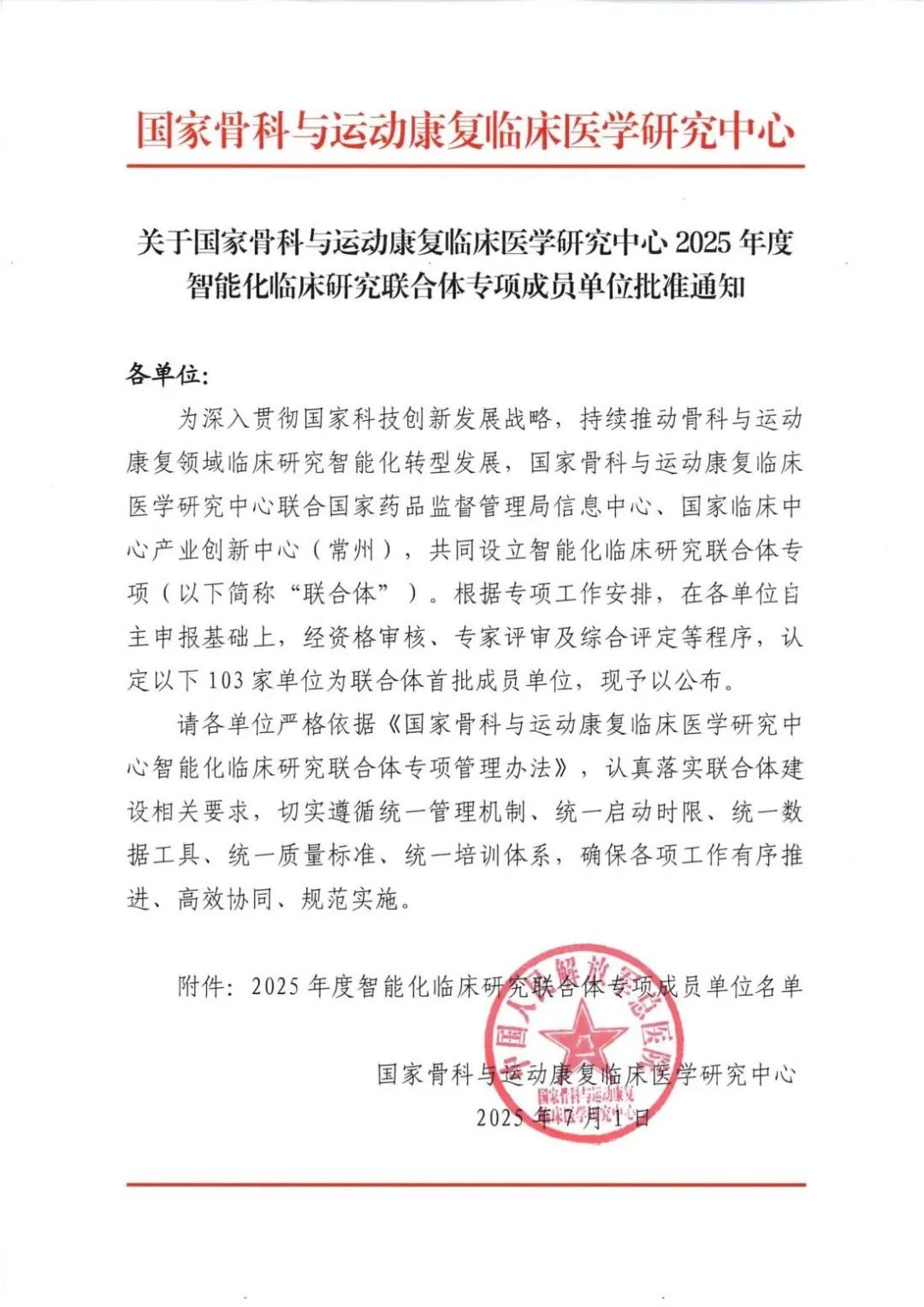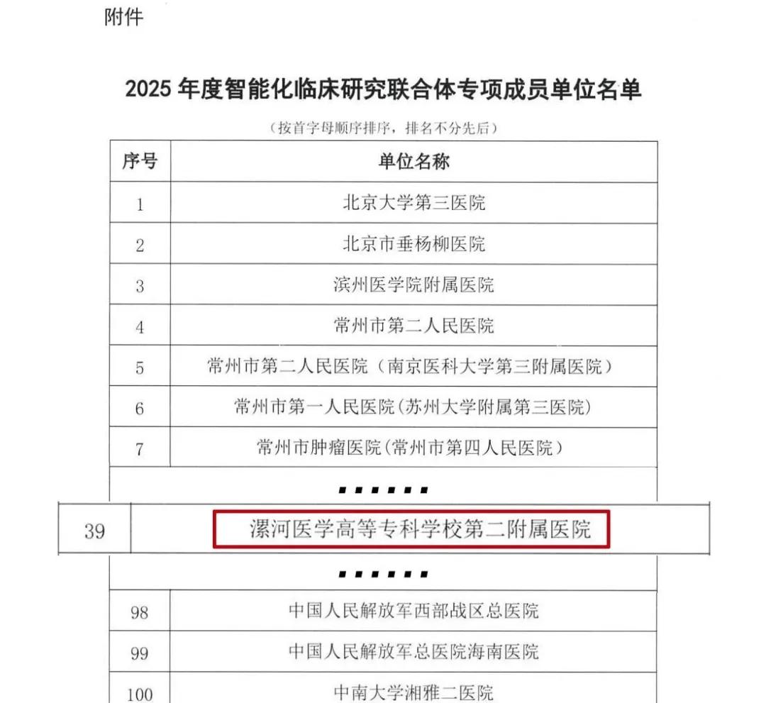由國家骨科與運動康復臨床醫(yī)學研究中心(以下簡稱“國家臨床中心”)聯合國家藥品監(jiān)督管理局信息中心、國家臨床中心產業(yè)創(chuàng)新中心(常州)共同設立的“2025年度智能化臨床研究聯合體專項”已完成首批成員單位遴選,共103家單位成功入選(具體名單見文末附件),覆蓋全國26個省份。 其中漯河醫(yī)專二附院成功入選國家臨床中心“智能化臨床研究聯合體專項”首批成員單位