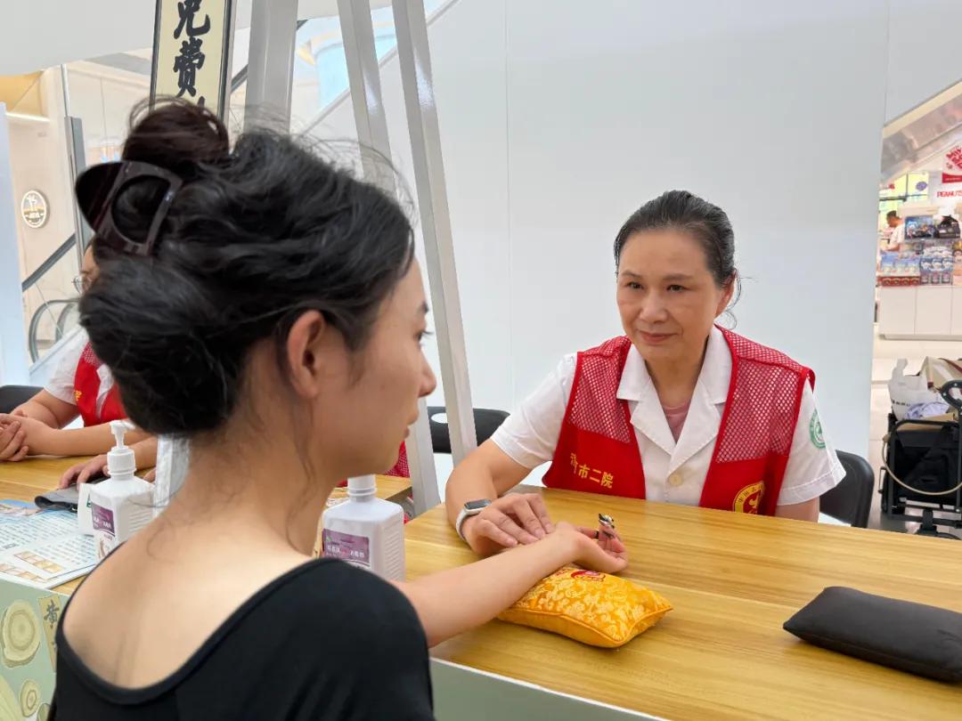 活動現(xiàn)場,市二院中醫(yī)針灸科精心設(shè)置了中醫(yī)把脈、中醫(yī)養(yǎng)生茶,耳穴壓豆,刮痧,火龍罐,艾灸,AI把脈,香囊展示,中藥材展示,測血壓等多個義診攤位,由10余名資深中醫(yī)專家組成的志愿服務(wù)團隊“坐鎮(zhèn)”,與市民群眾面對面交流,針對檢查中發(fā)現(xiàn)的問題,為群眾提供疾病防治建議、健康管理方案,給出針對性的預防和診療建議。