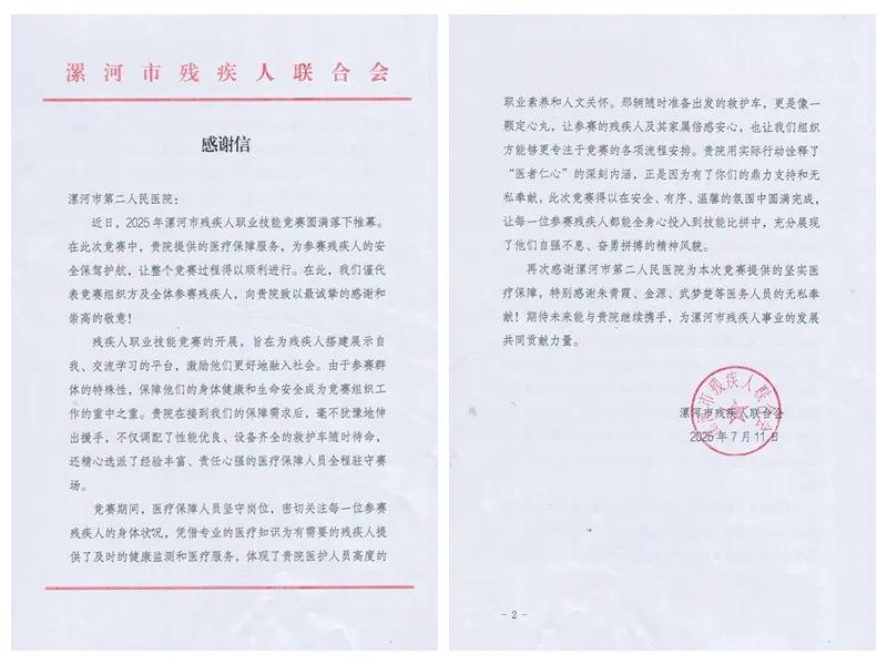 近日,市二院收到一封來自市殘聯(lián)發(fā)來的感謝信。信中高度贊譽(yù)醫(yī)院在2025年全市殘疾人職業(yè)技能競賽期間提供的全方位醫(yī)療保障服務(wù),稱其“用實(shí)際行動詮釋醫(yī)者仁心,為賽事筑起堅(jiān)實(shí)的安全防線。”