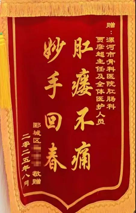 近日,在漯河醫(yī)專(zhuān)二附院(漯河市骨科醫(yī)院、漯河市立醫(yī)院)肛腸科,患者將一面寫(xiě)有“肛瘺不痛,妙手回春”的錦旗送到了賈彥超主任手中,以此表達(dá)她對(duì)賈主任及其醫(yī)療團(tuán)隊(duì)精湛醫(yī)術(shù)和貼心關(guān)懷的誠(chéng)摯感謝。這面錦旗背后,是一段患者重獲健康、擺脫病痛折磨的暖心歷程。