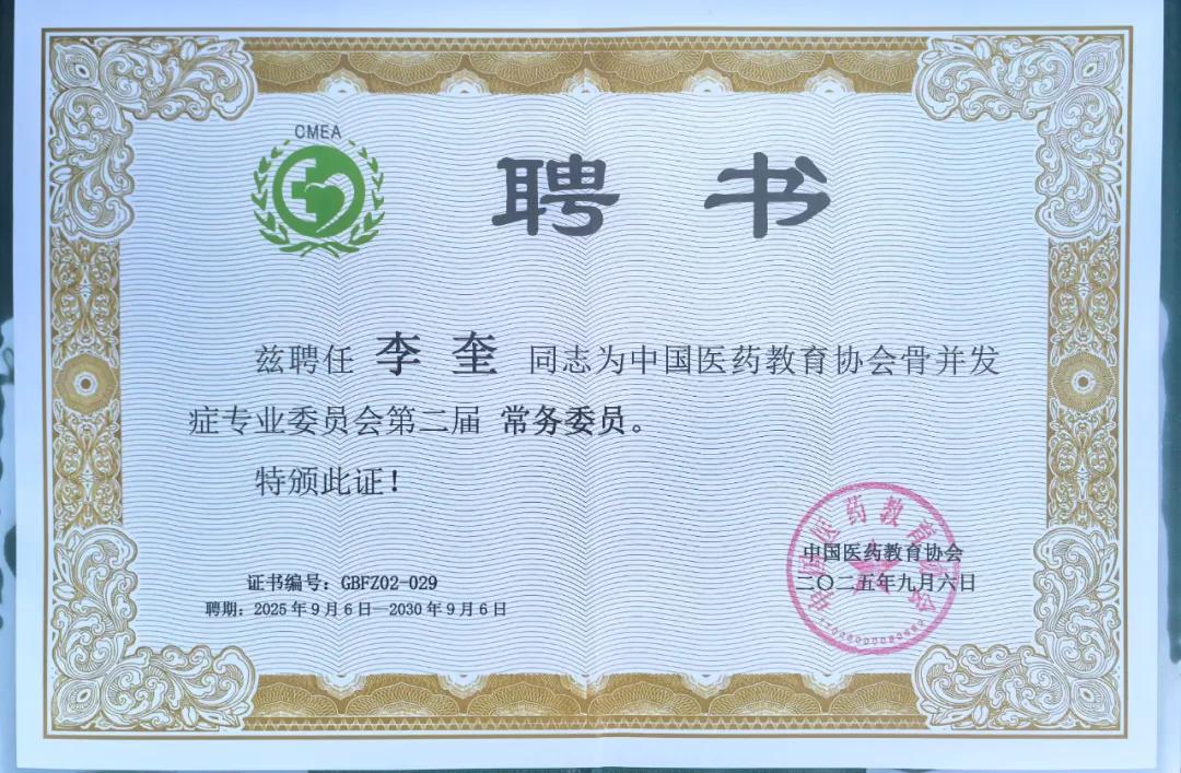 漯河醫(yī)專二附院名譽(yù)院長(zhǎng)李奎教授獲聘中國(guó)醫(yī)藥教育協(xié)會(huì)骨并發(fā)癥專業(yè)委員會(huì)常務(wù)委員