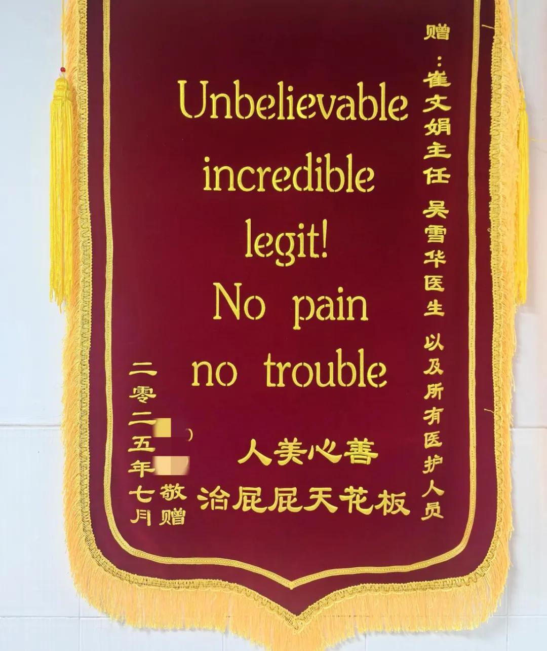 熟悉肛腸科的人都知道,這里時(shí)常因患者的 “巧思” 充滿歡樂,近期科室就接連收到了好幾面別具一格的錦旗。其中一面寫著 “Unbelievable incredible legit!No pain no trouble 人美心善 治屁屁天花板”,中西結(jié)合的表達(dá)既俏皮又真誠(chéng);還有一面則用 “手術(shù)不疼換藥不疼,肛好有你高水平!” 的諧音巧語傳遞謝意。這些充滿趣味的錦旗文字,從側(cè)面印證了肛腸科在創(chuàng)面疼痛管理方面取得了良好成效,也是患者對(duì)我們?cè)\療服務(wù)的肯定認(rèn)可。