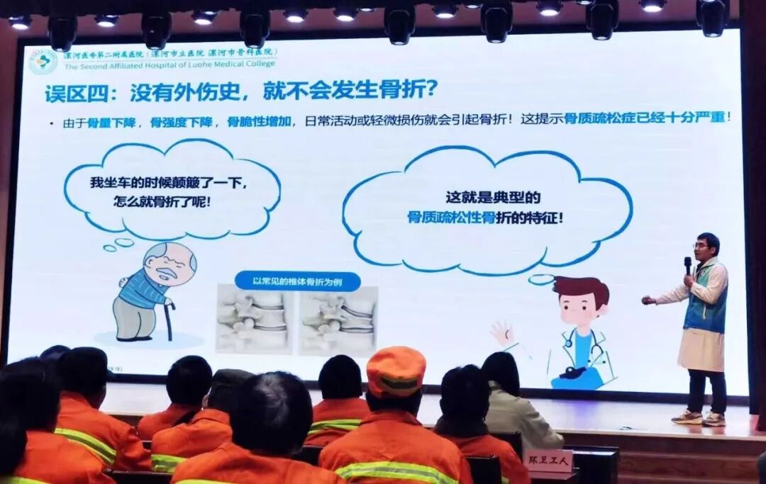 活動中,漯河醫(yī)專二附院骨科專家王松茂聚焦10月20日“世界骨質(zhì)疏松日”主題,針對基層群眾尤其是環(huán)衛(wèi)工人的工作特點(diǎn),開展骨質(zhì)疏松專題健康科普講座。講座內(nèi)容貼合群眾需求,從骨質(zhì)疏松的成因、早期癥狀、預(yù)防方法到日常養(yǎng)護(hù)要點(diǎn),進(jìn)行了通俗細(xì)致的講解,幫助群眾建立科學(xué)的骨骼健康認(rèn)知,為預(yù)防骨質(zhì)疏松奠定基礎(chǔ)。