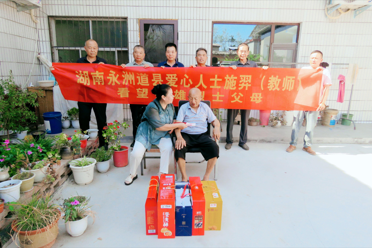 在八一建軍節(jié)即將來臨之際,7月29日下午,湖南省永州市道縣退休女教師、愛心人士施羿,為全國一級“戰(zhàn)斗英雄”李海欣烈士的父親李銀秀贈送了2000元的慰問金,祝英雄的父親八一建軍節(jié)快樂!身體健康!家庭幸福!