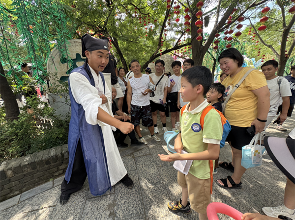 一踏入萬歲山武俠城,古色古香的宋代街巷和建筑便映入孩子們眼簾,仿佛穿越回了千年前的大宋。街道上,鄭記肉鋪、獅子樓、王婆茶莊等實景店鋪,充滿生活氣息,孩子們好奇地打量著,想象著古人的生活場景。街邊藝人的精彩表演引得孩子們陣陣驚嘆,歡呼聲此起彼伏?!度蜃<仪f》里,逼真的城墻、城門、大炮和烽火臺,激烈的戰(zhàn)斗場面配合影視爆破、云梯炮戰(zhàn)、大型馬術(shù)等實景拍攝技術(shù),將《水滸傳》中的情節(jié)鮮活呈現(xiàn),孩子們看得目不轉(zhuǎn)睛,被綠林好漢們的江湖豪情深深吸引,演出結(jié)束后,掌聲雷動。在萬歲山武俠城內(nèi),孩子們還觀賞了多場精彩絕倫的演出。從《吊環(huán)》的驚險特技到《大宋奇兵》的英勇無畏,再到《李逵斷案》和《林沖戰(zhàn)楊志》……此外,孩子們還進行了一系列互動體驗活動。通過石頭剪刀布、投壺等游戲來賺取銀票,換取自己喜歡的物品。每一場演出都讓孩子們陶醉其中,流連忘返。