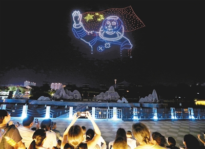 8月21日晚8時許,千架無人機(jī)在河上街景區(qū)騰空而起,瞬間點(diǎn)亮夜空?;鸺?、身著航天服在太空漫步的宇航員、繞地球飛行的天宮空間站……當(dāng)晚的千機(jī)飛“只有漯河”展演活動,以“太空之旅”為主題,吸引了眾多市民和游客。記者看到,市民、游客紛紛舉起手機(jī)、相機(jī),定格精彩瞬間(如圖)。