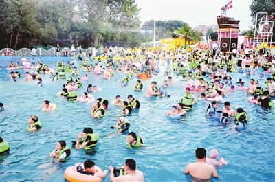 海盜船水寨前也是熱鬧非凡。家長牽著孩子的手穿過水簾,小沖天滑梯上的孩童像炮彈般滑入水池……專為兒童設計的戲水區(qū)里,水深二三十厘米,卡通造型的噴水玩具不斷噴出清水,孩子們玩得不亦樂乎。