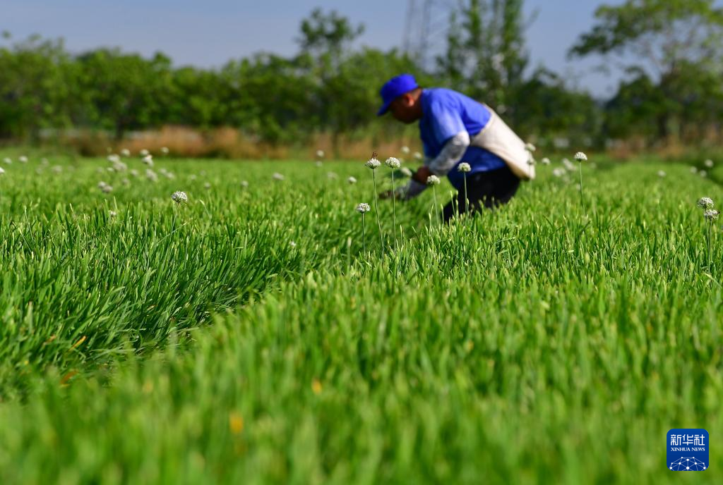 8月7日,采摘工在江蘇省無(wú)錫市惠山區(qū)玉祁街道一處蔬菜種植基地采摘韭菜花。
