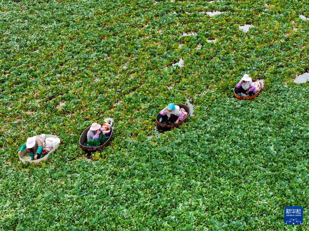 8月7日,江蘇省泰州市海陵區(qū)蘇陳鎮(zhèn)張家院社區(qū)農(nóng)民在菱塘采摘菱角(無(wú)人機(jī)照片)。